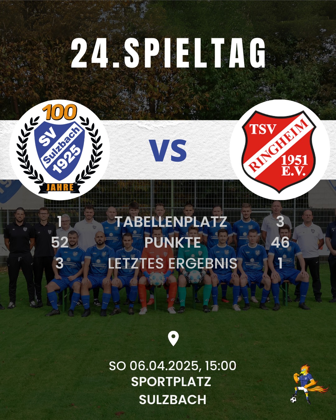 Im Anschluss steht ein sportlicher Kracher auf dem Tagesplan, denn die zwei Top-Favoriten auf die Meisterschaft der A-Klasse treffen aufeinander: Der Tabellenerste SV Sulzbach empfängt den Tabellendritten TSV Ringheim auf dem Spottenberg. Ringheim, mit einem Spiel weniger und 46 Punkten, konnte im laufenden Jahr mit 3 Siegen aus 3 Spielen den Abstand auf den SVS verkürzen und so das Rennen um den Platz an der Sonne wieder ordentlich spannend gestalten. Unser SVS ist zwar im Ligabetrieb des Kalenderjahres 2025 weiterhin ungeschlagen, dennoch musst man mit zwei Unentschieden bereits 4 Punkte einbüßen. Trotzdem bleibt weiterhin der erste Platz der Tabelle mit 52 Punkten. Was auf jeden Fall Mut gegen die form-starken Ringheimer macht, ist der 1:3 Auswärtssieg aus dem Hinspiel, in dem Sulzbach durch eine kämpferische Leistung sogar einen Rückstand aufholen konnte. Definitiv ist eine sehr spannende Partie zu erwarten, in denen Details ausschlaggebend sein werden. Um 15 Uhr wird sich auf dem Spottenberg zeigen, wer die Nase auf dem Platz vorn haben wird.