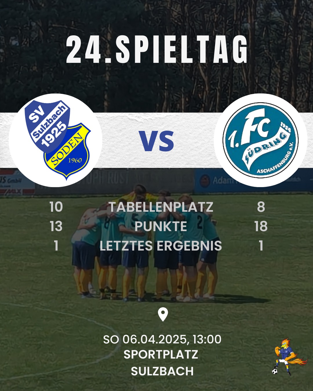 Nach einer starken Leistung durch eine sehr erfahrene Mannschaft in Erlenbach konnte unsere SG den ersten Punkt des Kalenderjahres gegen den Tabellenzweiten der Liga sammeln. Diese Woche geht es mit der 1B des 1. FC Südring gegen den Tabellenachten der B-Klasse. Die SG vom Untermain befindet sich nach wie vor auf dem 10. Platz der Tabelle. So steht also ein Duell auf Augenhöhe auf dem Plan, was auch im Hinspiel (1:1) keinen Sieger fand. Anpfiff ist diesmal Sonntags um 13 Uhr in Sulzbach.