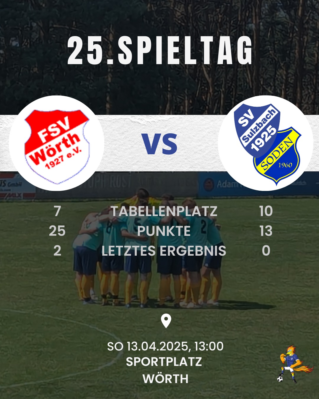 Die SG vom Untermain fand in diesem Jahr -vor allem Ergebnis-technisch- noch nicht in die Spur. Nach einem Lichtblick in Erlenbach musste man am vergangenen Spieltag eine ärgerliche Niederlage zuhause verbuchen. Vielleicht klappt es ja mit dem ersten 3er gegen Wörth. Der FSV steht aktuell auf Platz 7 mit 25 Punkten und konnte unserer 1B ein 0:2 in Soden abringen. Unsere Jungs belgen aktuell den 10 Platz mit 13 Punkten. Wie jede Woche, kann man nicht klar sagen, wie die Kräfteverhältnisse aufgeteilt sind. Klarheit wirds am kommenden Sonntag um 13 Uhr in Wörth geben.