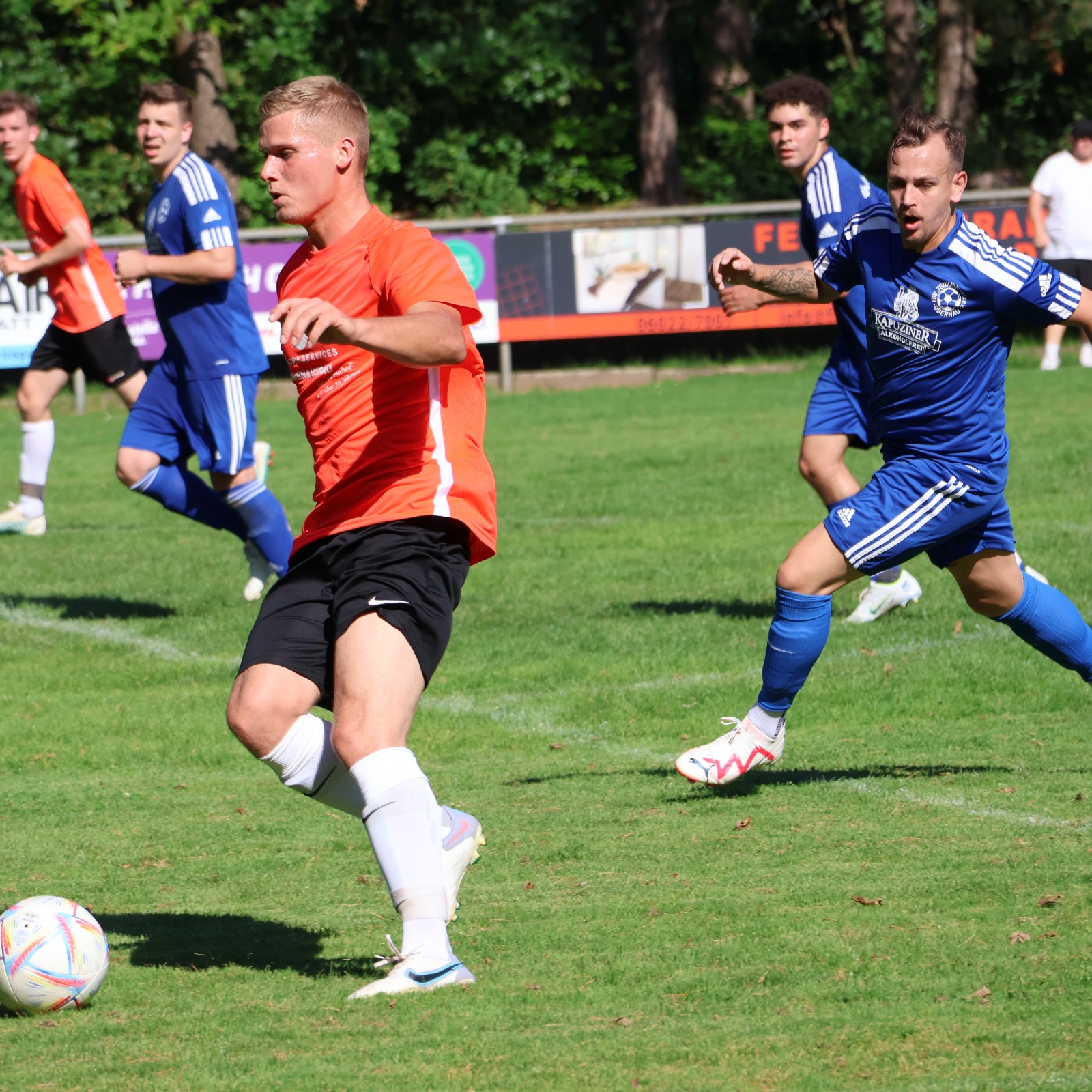 Das Wetter heiß und der Rasen hoch – anstrengende Bedingungen zum Leistungssport. Doch mit kühlem Kopf und klarer Taktik kam der SVS gut in die Partie. Bereits in der 8. Minute konnte Stefan Leginszki mit einem Dribbling mehrere Abwehrspieler hinter sich stehen lassen und durch einen kraftvollen Schuss an der Grenze zum Strafraum mit dem 1:0 ein erstes Ausrufezeichen setzen. Hungrig auf ein weiteres Tor konnte erneut Stefan Leginszki, der durch einen Steilpass an der Mittellinie in die Tiefe geschickt wurde, das 2:0 erzielen (38. Minute). Kurz vor dem Halbzeit-Pfiff konnte Kevin Zühlow einen Abpraller aus nächster Nähe an die Unterkante der Latte und schließlich hinter die Linie des Obernauer Tors zum 3:0 schießen. Hälfte 2 begann ähnlich torreich: So konnte das Tor von Louis Baumann in Minute 49 und der Treffer von Jens Krause in Minute 65 den Spielstand auf 5:0 erhöhen. Das fast perfekte Derby erlitt jedoch in Spielminute 69 durch den Treffer der Gäste zum 5:1 Endergebnis einen kleinen Schönheitsfehler.